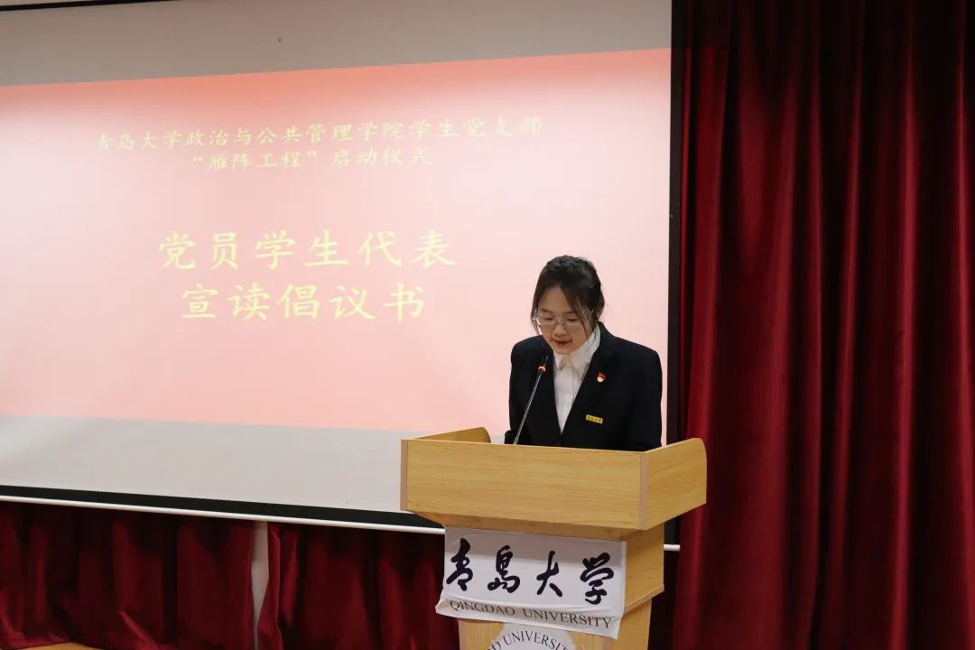 之后,员工党员代表张荣玺宣读“雁阵工程”倡议书。向全体“雁阵工程”成员发出倡议,呼吁全体学员们以饱满的热情、昂扬的精神面貌,积极主动地投入到“雁阵工程”计划的实施中去,努力做到“讲规矩,听号召”、“讲品德,秉初心”、“讲学习,夯理论”、“讲行动,懂奉献”,生其时,担重任,为公司的建设贡献你我的力量。