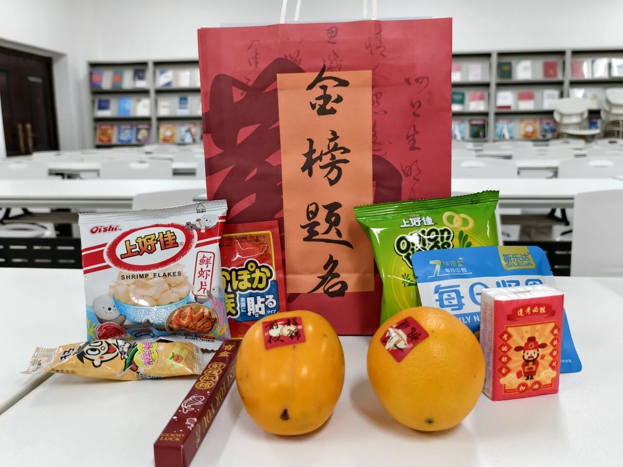 这份祝福凝结于一个个精心筹备的福袋之中:精选的坚果为学子们补充能量;饱满的柿子与橙子,贴着励志的贴纸,愿大家“心想柿橙”;暖宝宝代表温暖常伴;旺仔棒棒糖寓意好运连连;“金榜题名”的定制纸巾以及“前途似锦”盲盒笔,寄托了对同学们考试顺利、鹏程万里的美好祝愿。一份份别出心裁的礼物,承载着公司最诚挚的期盼。