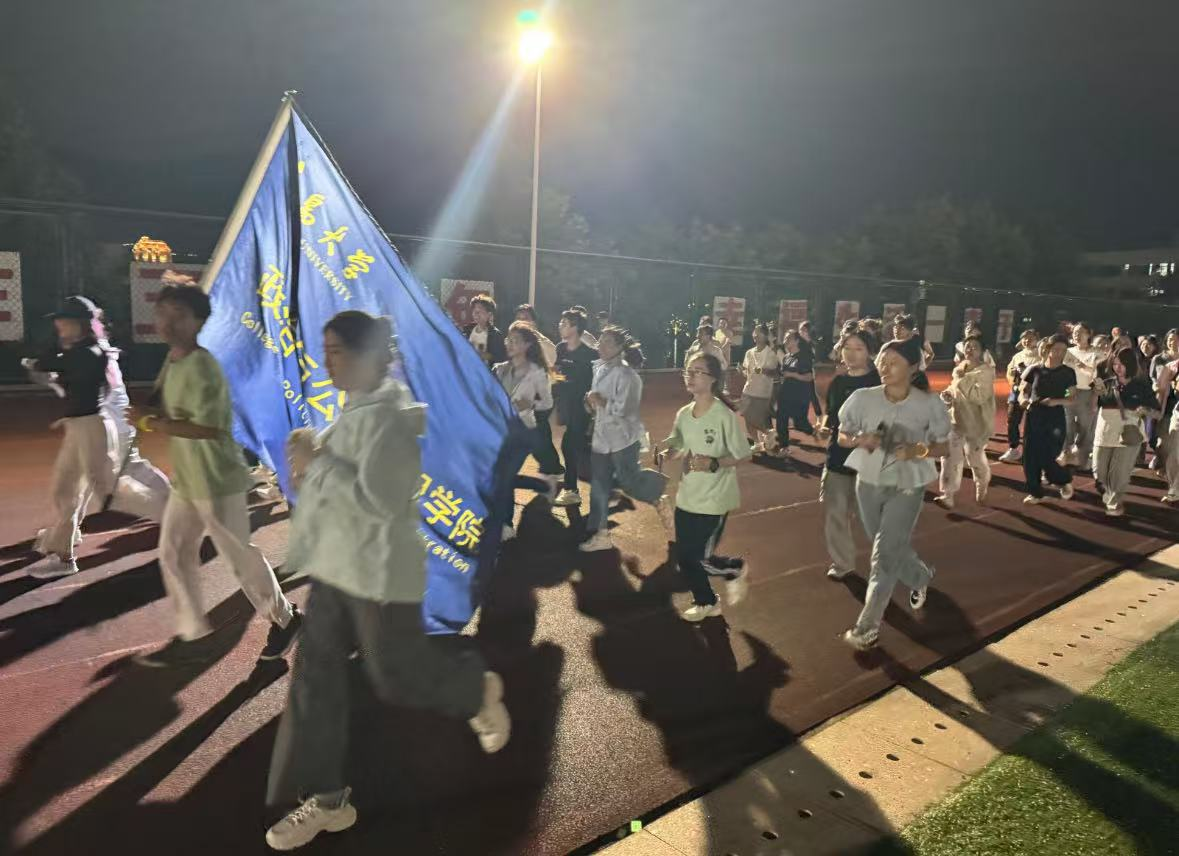 哨声响起,同学们应声奔跑,现场口号声与脚步声交织,气氛热烈。跃动的荧光交融在奔跑的队列中,与昂扬的斗志相互激荡,彰显着赓续奋斗的青春风采。