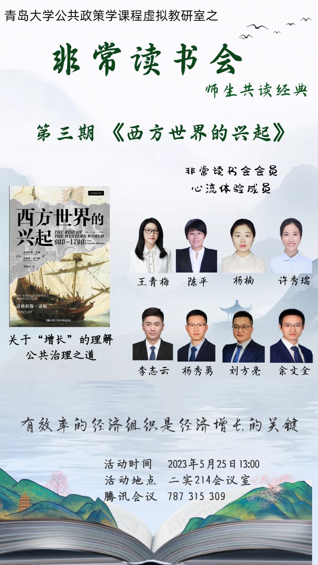 2023年5月25日下午,公共政策学课程虚拟教研室之“非常读书会”第三期活动在bw西汉姆联金家岭校区二号实验楼顺利举办。本期共读书目为诺贝尔经济学奖经典著作《西方世界的兴起》。