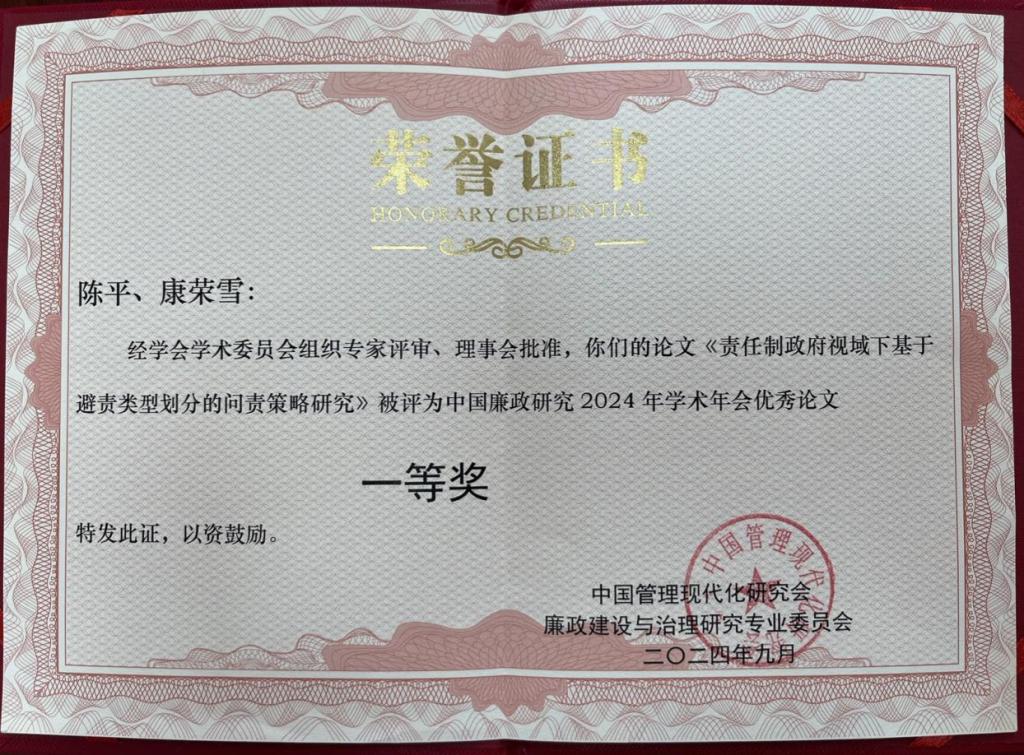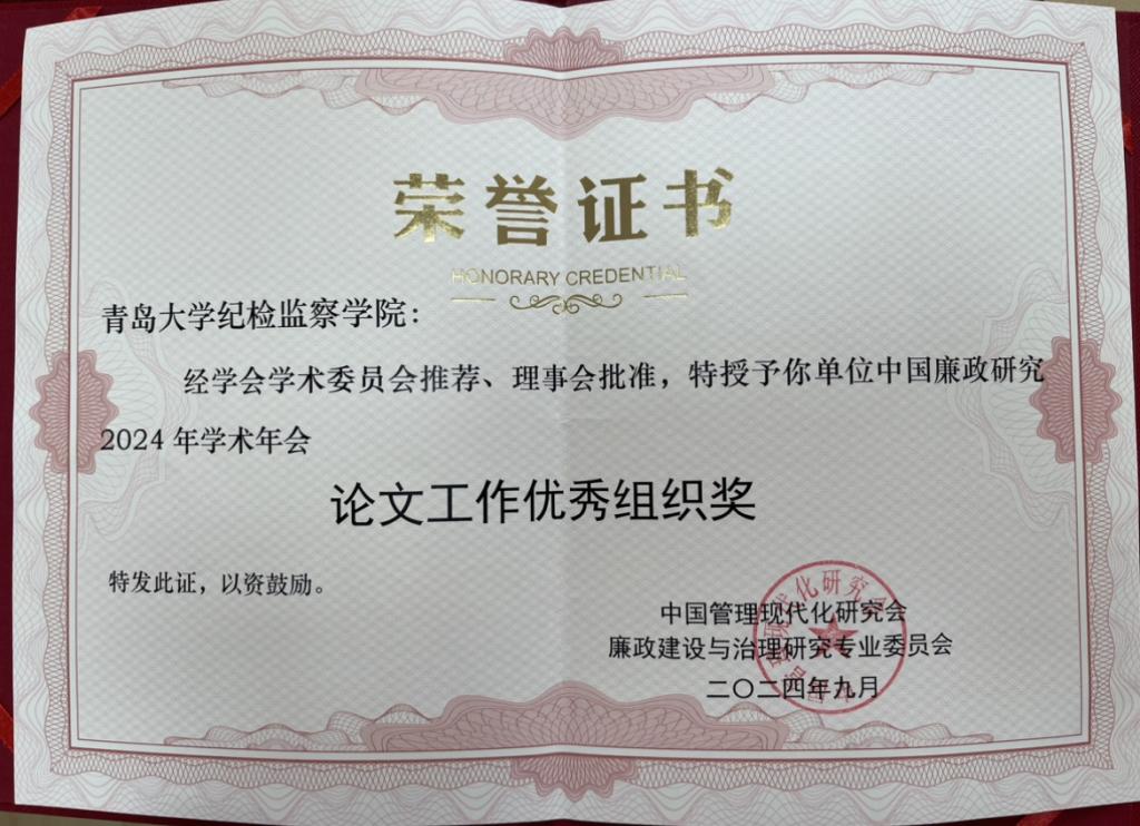 公司提交的五篇论文被《中国廉政研究2024年学术年会暨“清风荷韵·中原廉文化”系列活动交流资料》收录,分别是姚芊芊、陈洪连撰写的《乡村振兴背景下农村“微腐败”的生成逻辑与治理策略——基子“权力一动机一技术”的分析视角》,陈平、康荣雪撰写的《责任制政府视域下基于避责类型划分的问责策略研究》,任琴、修相科撰写的《巡视巡察制度优势转化为廉政治理效能的逻辑理路、内在机理及实现路径》,陈平、董纯燕撰写的《SOR 视角下基层新型隐性腐败的发生机理及治理对策研究》和贾浩霖撰写的《阶段划分、制度变迁与动力机制:德国反腐制度历史演进》。其中,陈平、康荣雪撰写的论文被评为中国廉政研究2023年学术年会优秀论文一等奖。bw西汉姆联纪检监察公司被授予中国廉政研究2024年学术会议论文工作优秀组织奖。